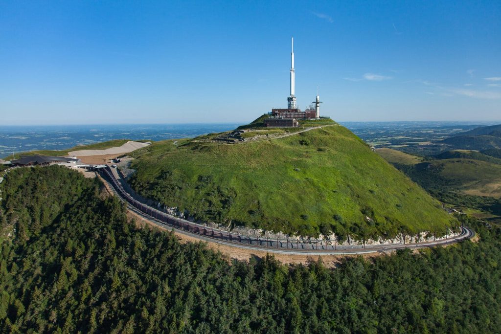 E2CCYN France, Puy de Dome, Parc Naturel Regional des Volcans d’Auvergne (Natural regional park of Volcan d’Auvergne), Chaine des Puys, Orcines, the Puy de Dome, rails of the cog railway (aerial view)